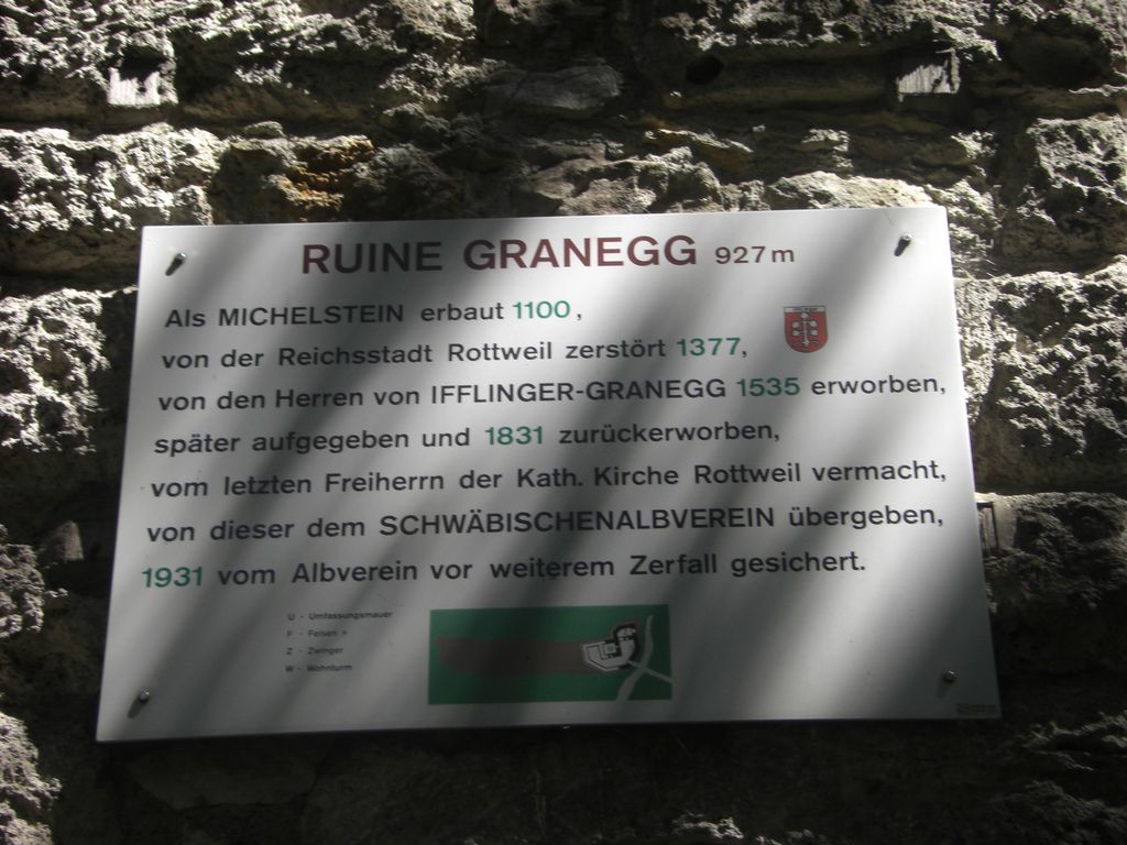 Herbst Nebelschwaden aus ihr hervor waberten. Um die Ruine Michelstein wurde es dann still. Wenn in späterer Zeit vom Michelstein oder vom Lehen Michelstein die Rede ist, dann muß darunter der Grundbesitz verstanden werden, der zur Burg gehört hatte. Ende des 18. Jahrhunderts waren dies noch 36 Jauchert Ackerland. Um 1400 waren die Herren von Balgheim Eigentümer des Michelsteins. Im Tausch gegen anderes Eigentum übereignete Burkart von Balgheim 1427 „Michelstein das Burgstall mit seinen Zugehörden, Nutzen und Gülten“ an Herzog Friedrich von Österreich, erhielt es dann aber zusammen mit anderen Stücken wieder als Lehen. Michelstein wurde so Bestandteil des Burglehens Fridingen, zu dem sieben Einzellehen gehörten und das in dieser Zusammensetzung bis 1793 fortbestand. 1497 verkaufte Reinhart von Balgheim das Lehen an Konrad vom Stein. Bereits 40 Jahre später veräußerte dessen Sohn Wolf Sigmund vom Stein von Steinegg das Burglehen für 2175 Gulden weiter an Hieronymus Ifflinger von Granegg. Bis 1793 blieben die Ifflinger ohne Unterbrechung im Besitz des Lehens. Die Ifflinger nannten sich nach ihrem Schloß Granegg bei Niedereschach. Im Laufe der Jahre wurde der Name Granegg dann auch auf den Burgstall Michelstein übertragen, und mit der Zeit hat er den alten Namen ganz verdrängt und in Vergessenheit geraten lassen. Es muß in diesem Zusammenhang festgehalten werden, daß sich die Ifflinger nicht nach der Burg Michelstein-Granegg bei Egesheim nannten, sondern daß die Granegg bei Egesheim ihren Namen von den Ifflingern erhalten hat. Karl Alexander Ifflinger verkaufte 1793 das im Jahr zuvor allodifizierte (in Eigentum verwandelte) Burglehen für 95.000 Gulden an die beiden Juden Emanuel und Michael Levi. Schon kurze Zeit später veräußerten diese ihren neu erworbenen Besitz an die Stadt Fridingen weiter. Von der Stadt Fridingen kam Michelstein in private Hände. Das Michelstein-Gut wurde 1831 von Thomas Sieger aus Egesheim gekauft. Inmitten des Grundbesitzes baute er den Michelstein-Hof. In kurzen Zeitabständen wechselten die Eigentümer, bis der letzte den Hof im Jahre 1872 für 10.000 Mark an die Gemeinde Egesheim verkaufte. Das Hofgut wurde aufgeteilt, der Hof abgebrochen. Aus Pietät und Familiensinn kaufte Carl Joseph Ifflinger, der Enkel Karl Alexanders, den Burgstall 1831 zurück. Sein Sohn Alfred vermachte ihn testamentarisch der Katholischen Kirchenpflege Rottweil, und diese übergab ihn 1932 dem Schwäbischen Albverein. An die 1000 Albwanderer kamen zu der feierlichen Übergabe am 12. Juni nach Egesheim. Unter Leitung von Stadtbaurat Blessing aus Rottweil wurden im Sommer die notwendigen Wiederherstellungsarbeiten an der Ruine von Maurermeister Cajetan Stier aus Bubsheim ausgeführt. Seither ist die Granegg ein beliebtes Ausflugsziel für Wanderer von nah und fern.