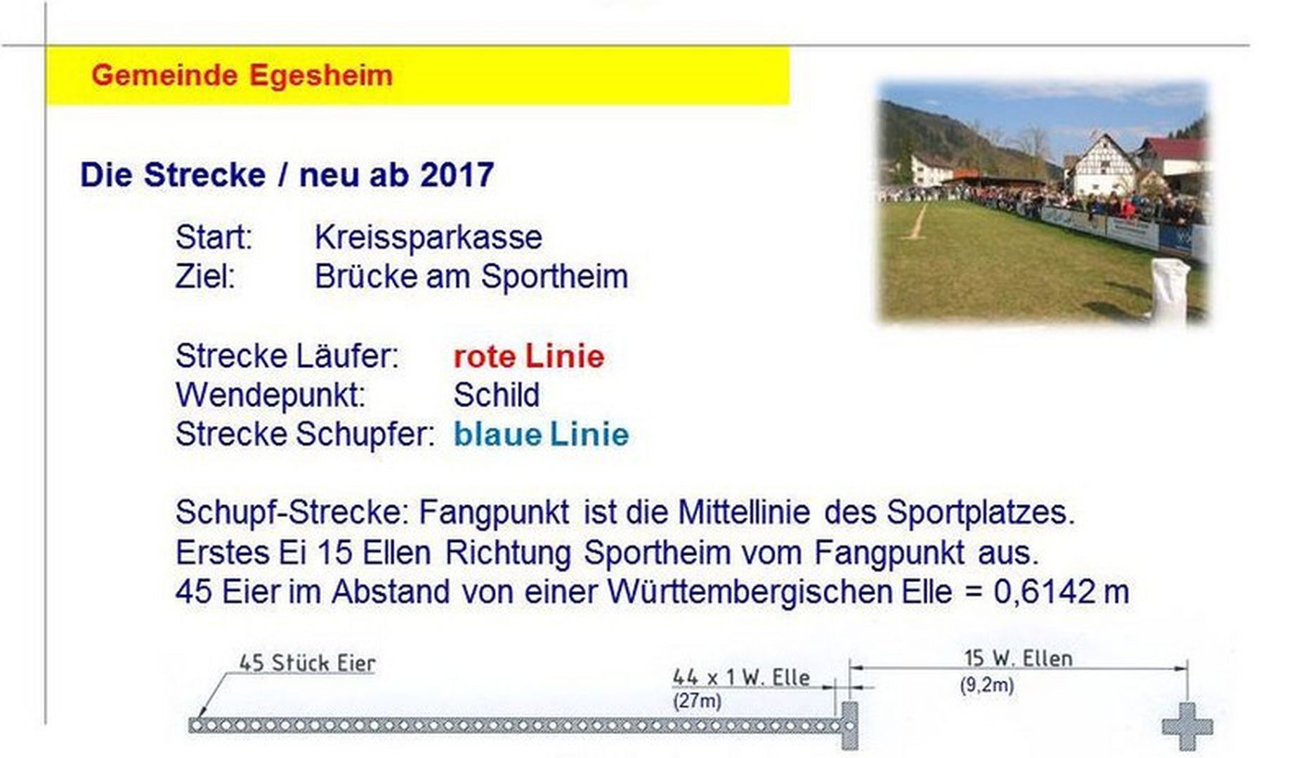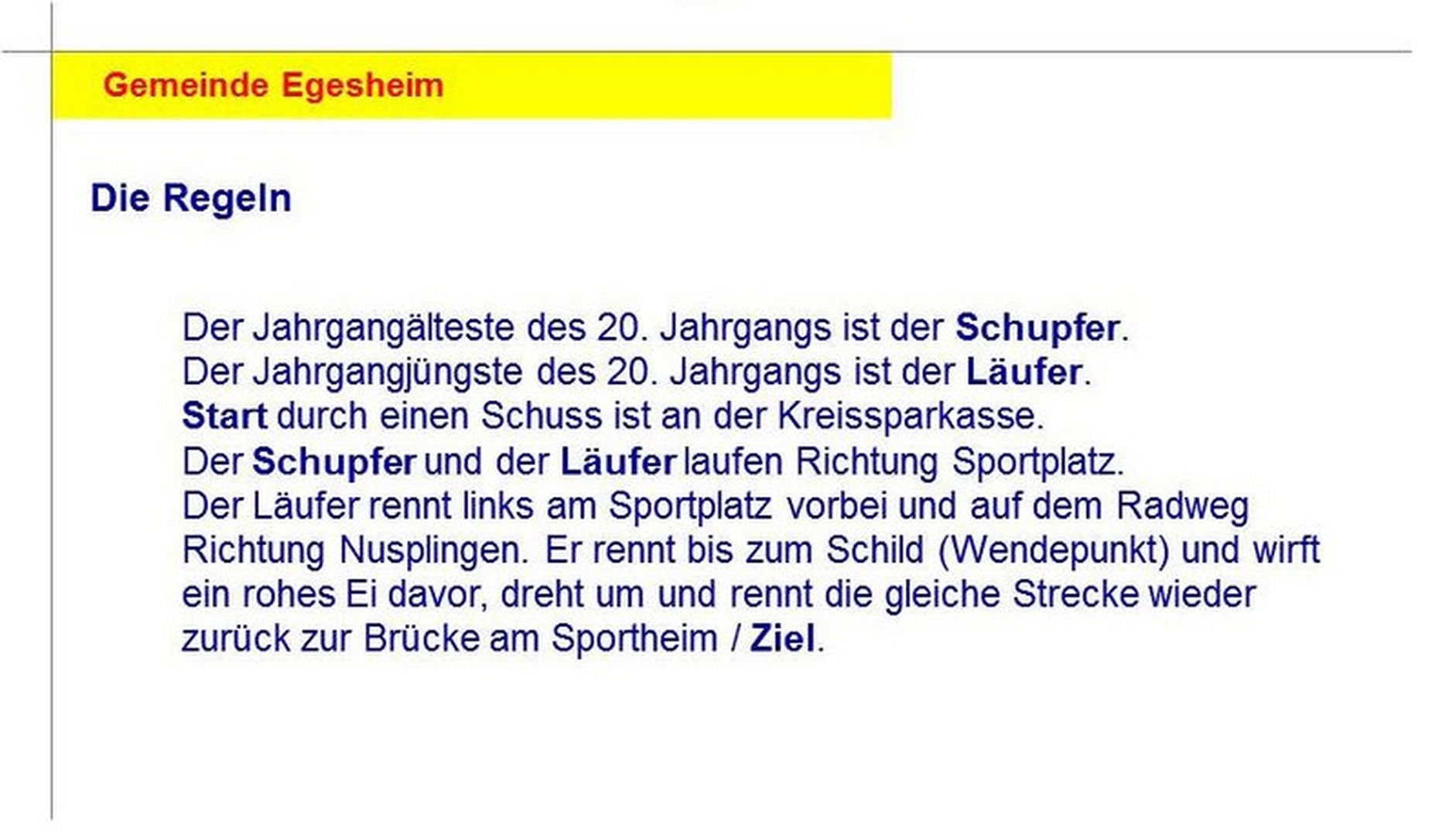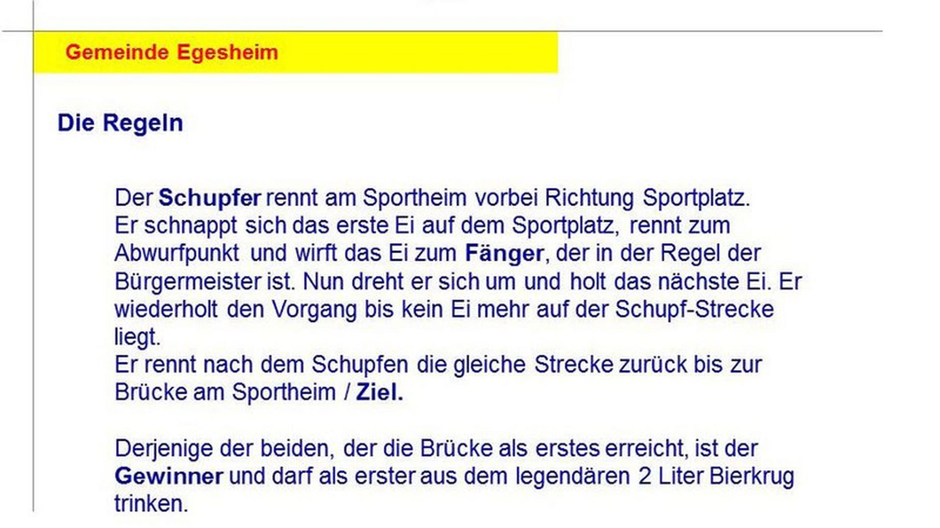 Dort schnappt er das erste Ei und rennt entlang der gestreuten Linie bis zum Abwurfpunkt wo er das Ei zum Fänger (in der Regel der Bürgermeister) wirft.