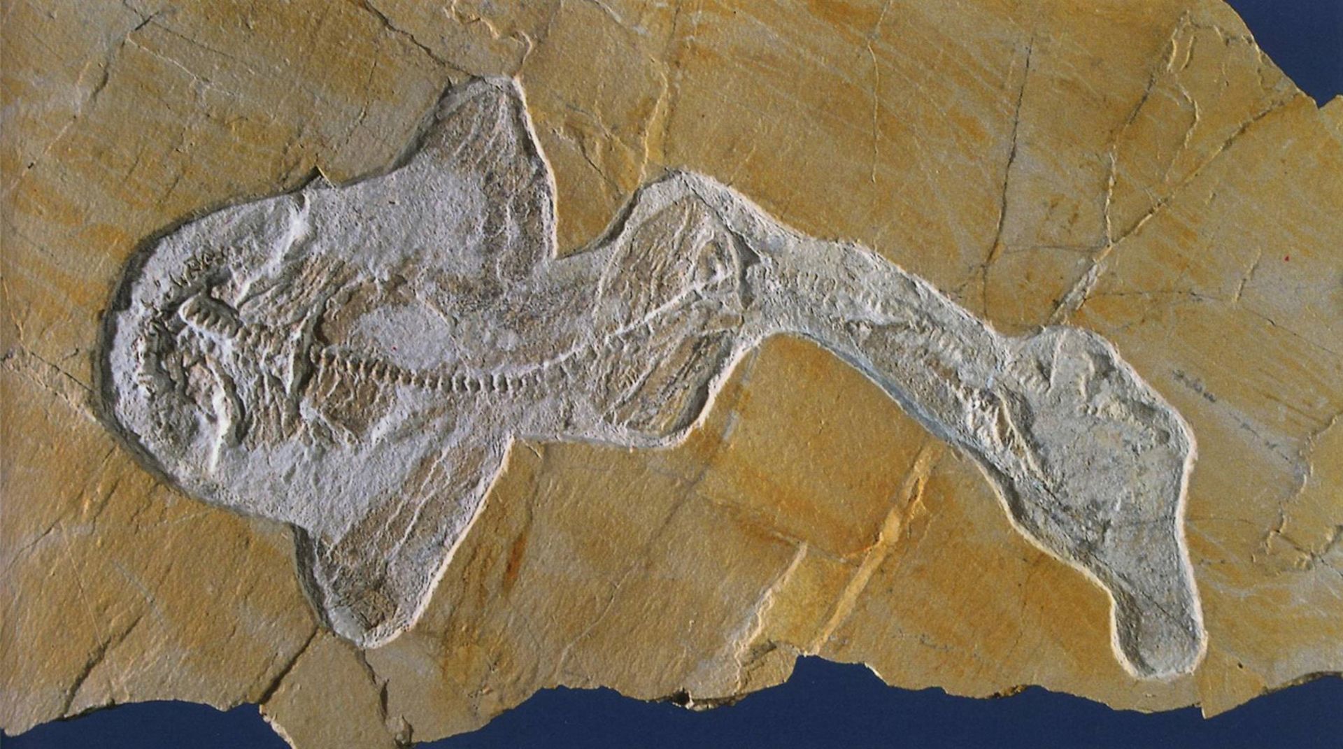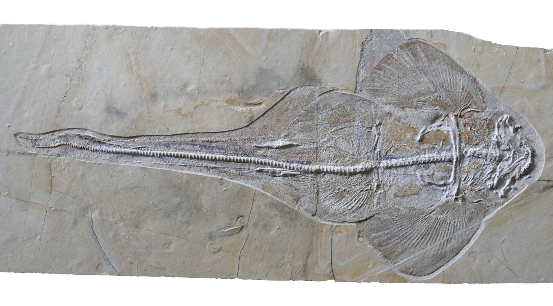Abb. 1: Der Meerengel Pseudorhina acanthoderma (ca. 125cm lang), Altfund aus dem Nusplinger Plattenkalk. Die Meerengel sind die auffälligsten Fossilien des Nusplinger Plattenkalks. Foto: R. Harling.