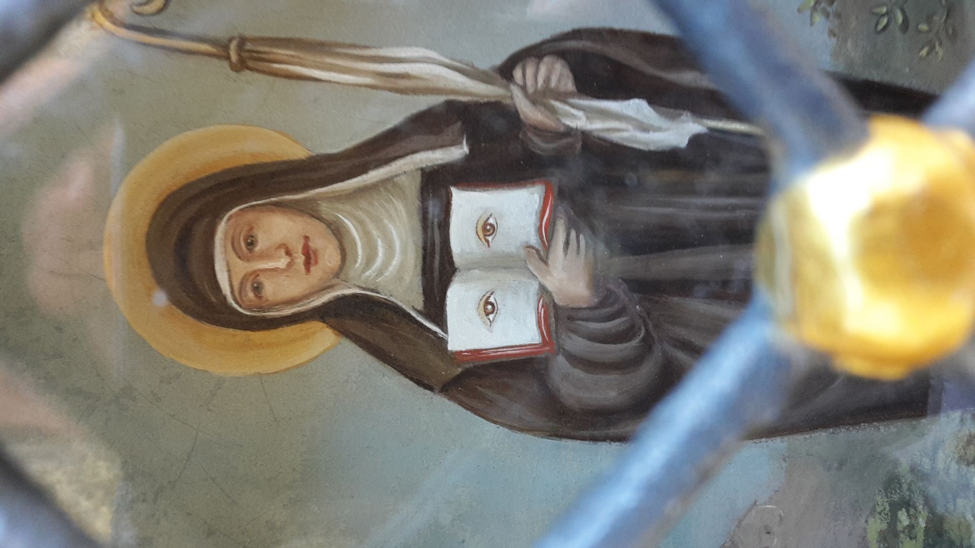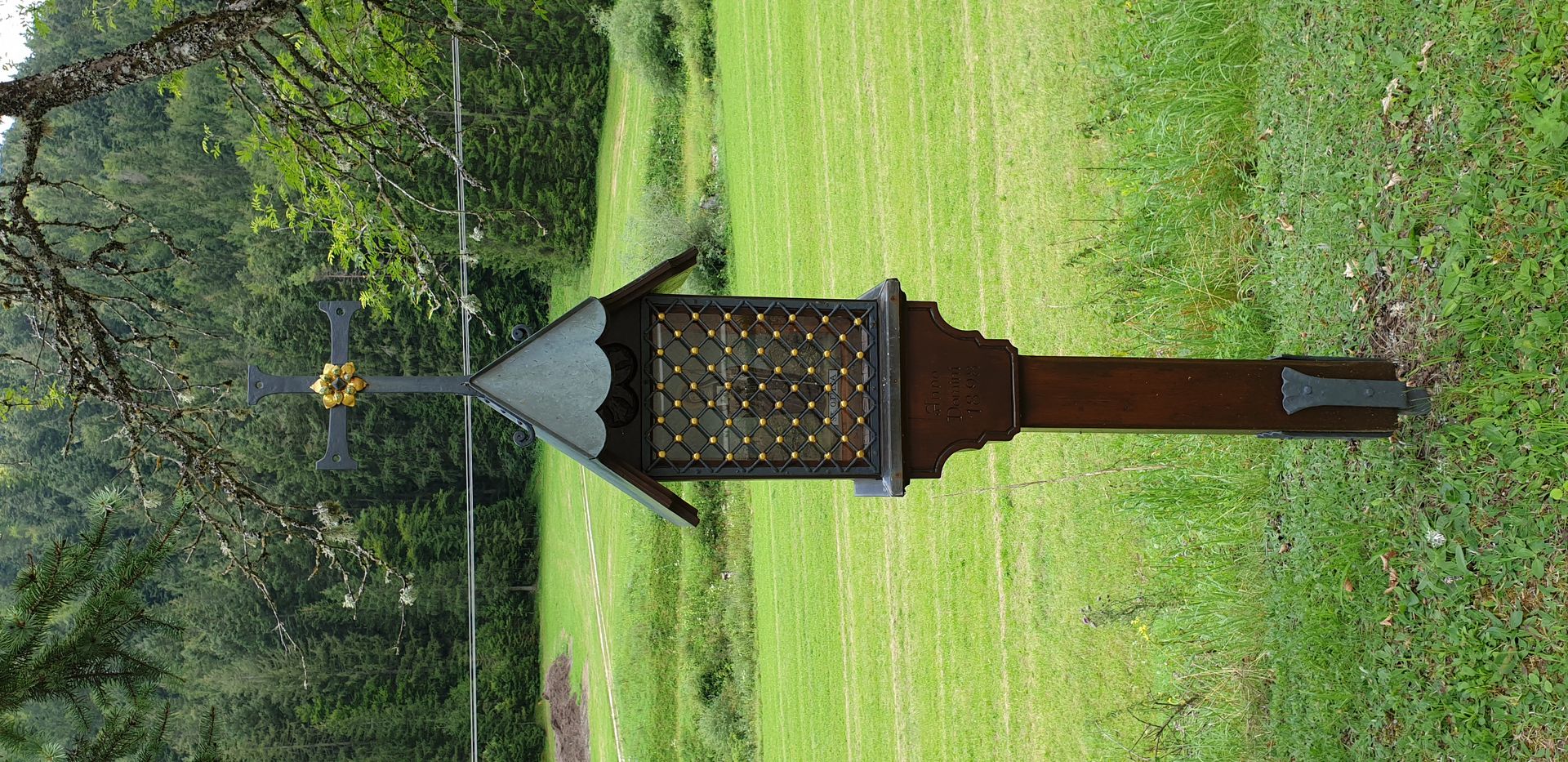 Lass den Blick Richtung der Straße nach Bubsheim schweifen. Dort ist der Ottilienbildstock zu sehen, der einst auf dem Platz eines ehemaligen Anhauser Kirchleins stand. Der Bildstock wurde während des neuen Straßenbaus nach Bubsheim an den jetzigen Standort versetzt. Nach seinem Vorbild wurden die neuen Bildstöcke des Kreuzweges bei der Loretto-Kapelle gefertigt.