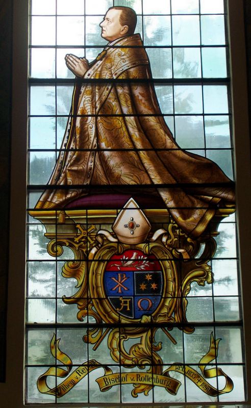 Das Abbild des in Egesheim geborenen Bischof Wilhelm von Reiser ist in einem wunderbaren Bleiglasfenster festgehalten. Er wurde am 13. Mai 1835 geboren, war ab dem 11. Juli 1893 Bischof von Rottenburg und starb am 11. Mai 1898. Sein Geburtshaus stand gegenüber den Kircheneingangs.